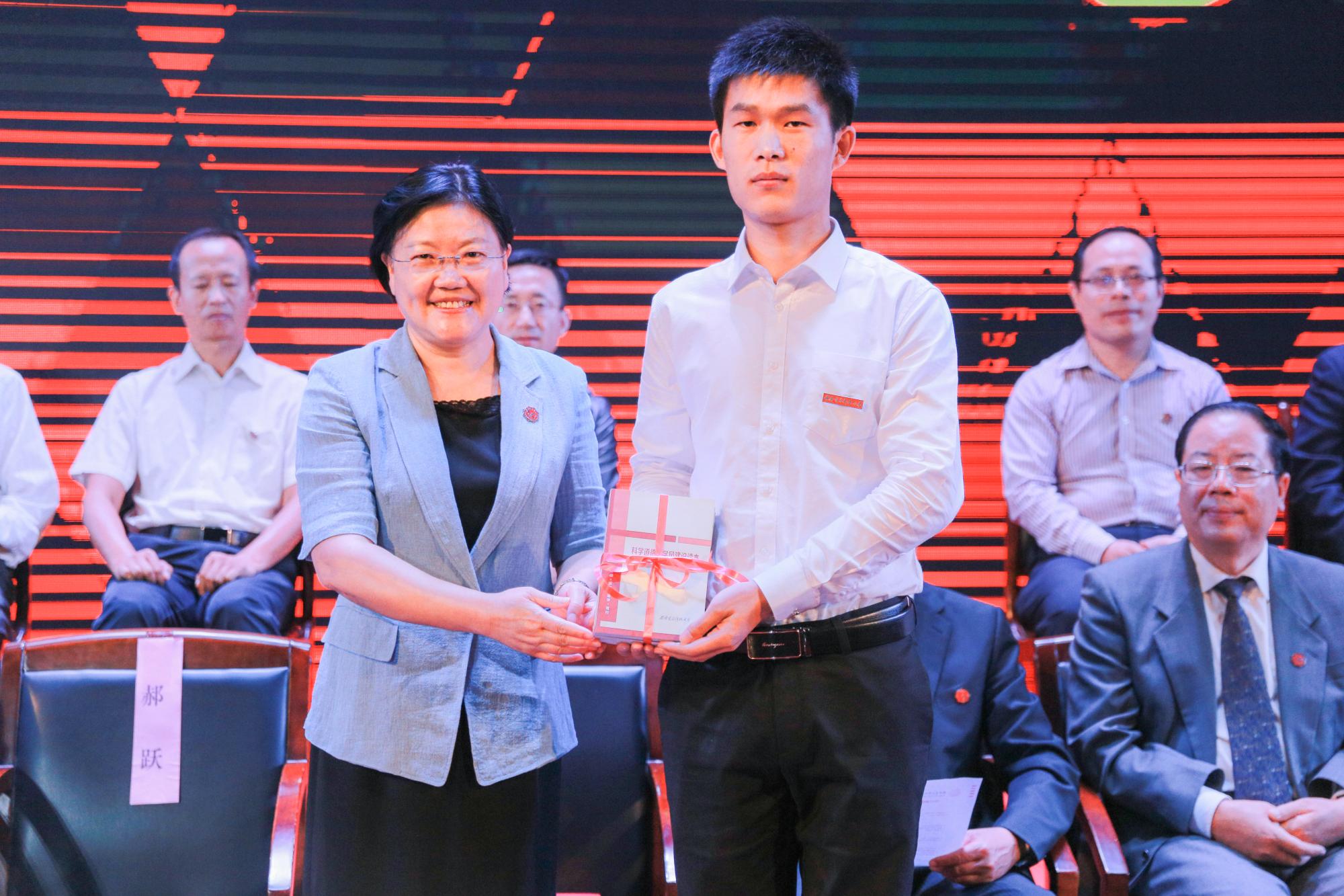 郑晓静校长为新生代表颁发《科学道德和学风建设读本》,希望广大师生进一步增强科研诚信意识,强化学术道德自律,培养严谨求实的学风。