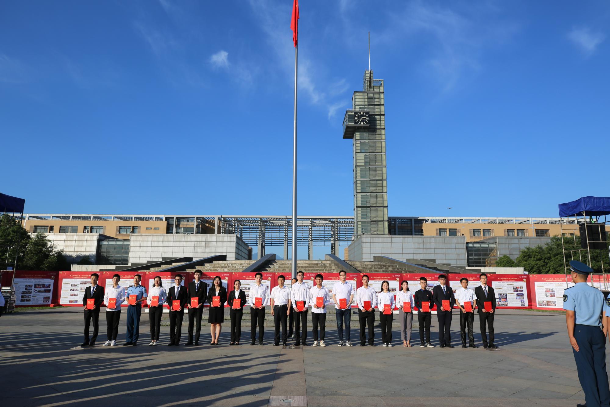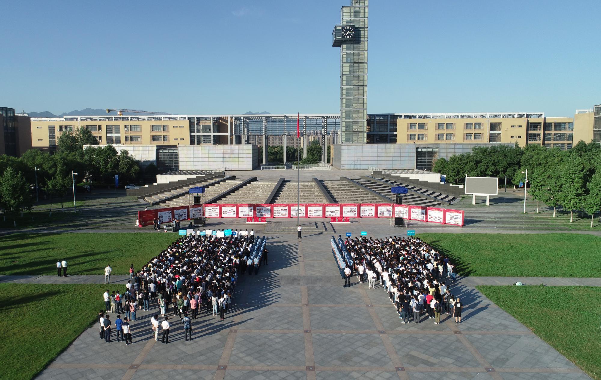面向党旗,向党做出庄严的承诺。上千名师生党员宣誓声在礼仪广场上空久久回荡。