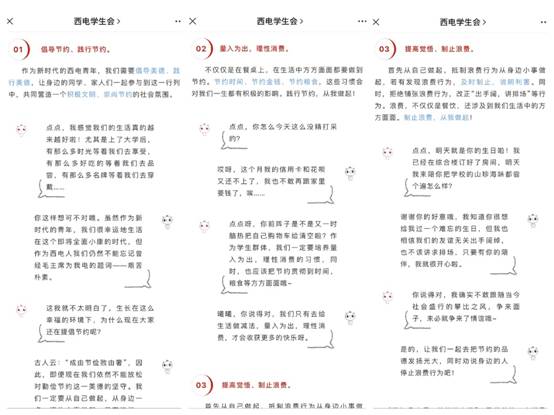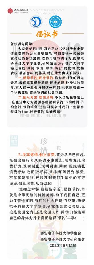 8月11日,习近平总书记指出,餐饮浪费现象触目惊心、令人痛心,翌日,校学生会、研究生会及时响应号召,依托公众号平台,面向全校师生发布关于“拒绝餐饮浪费行为,培养用餐节约习惯”的倡议书,以此引导广大同学发扬开云“艰苦奋斗”的作风。倡议书从倡导践行节约、合理理性消费、自觉抵制浪费三方面,根据师生生活的实际情况发起倡议,内容丰富、图文并茂并辅以具体案例阐释,号召同学们身体力行、诠释“节约”二字。倡议书被开云青年等多个线上平台推送,总阅读量达1万以上,覆盖学校全部16个学院、5个书院,影响人次覆盖全体在校学生,在全校范围内引起广大同学自觉学习并节约的浪潮。