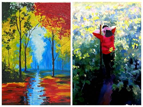 丙烯画《林间》(经济与管理学院栾钰涵)水粉画《田间的妇女》(微电子学院徐田甜)
