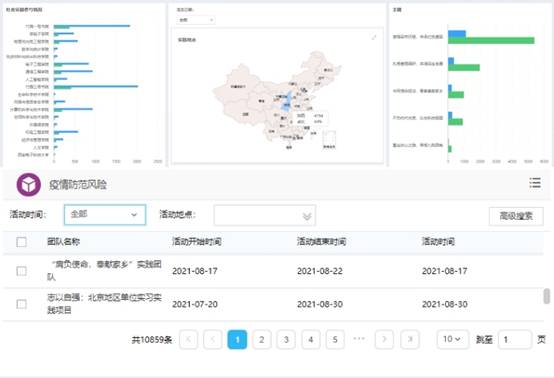 数据赋能,以一站式信息平台建设保障教育评价科学性。为进一步推进信息化术与共青团工作的深度融合,发挥学校电子信息学科与大数据应用的技术优势,2021年,学校在原有系统逻辑框架的基础上完善社会实践信息平台,实现项目申报、过程管理、材料审核、评优评先等一站式管理,学生、指导教师、学(书)院参与情况通过系统后台分析,为精准描绘“学生画像”提供客观数据支撑。同时,实践开展过程中,面对部分省市地区新冠肺炎疫情与汛情的突发情况,学校依托系统精确与当日当地开展活动的实践团队联系进行预警,与通过信息发布平台及时更新安全公告,调整实践安排。