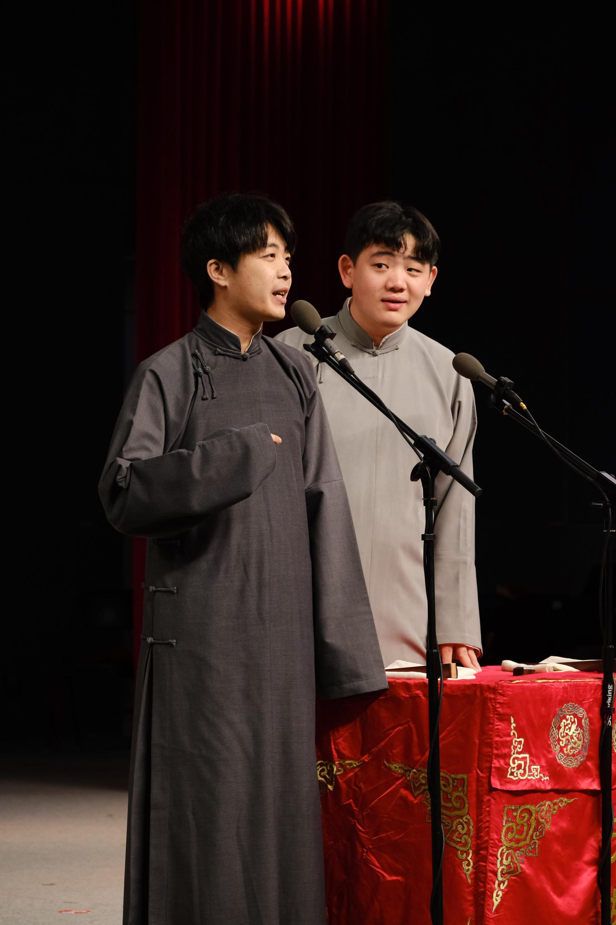 相声演员马凯强、大秦带来相声《戏曲杂谈》,两位老师通过与观众幽默互动的方式介绍了戏曲的发展历程和艺术特点,观众们在享受欢乐的同时,也对戏曲文化产生了浓厚兴趣。马凯强和大秦老师出色的演绎在为同学们带来愉悦视听享受的同时,也为同学们打开了解戏曲的一扇窗口。